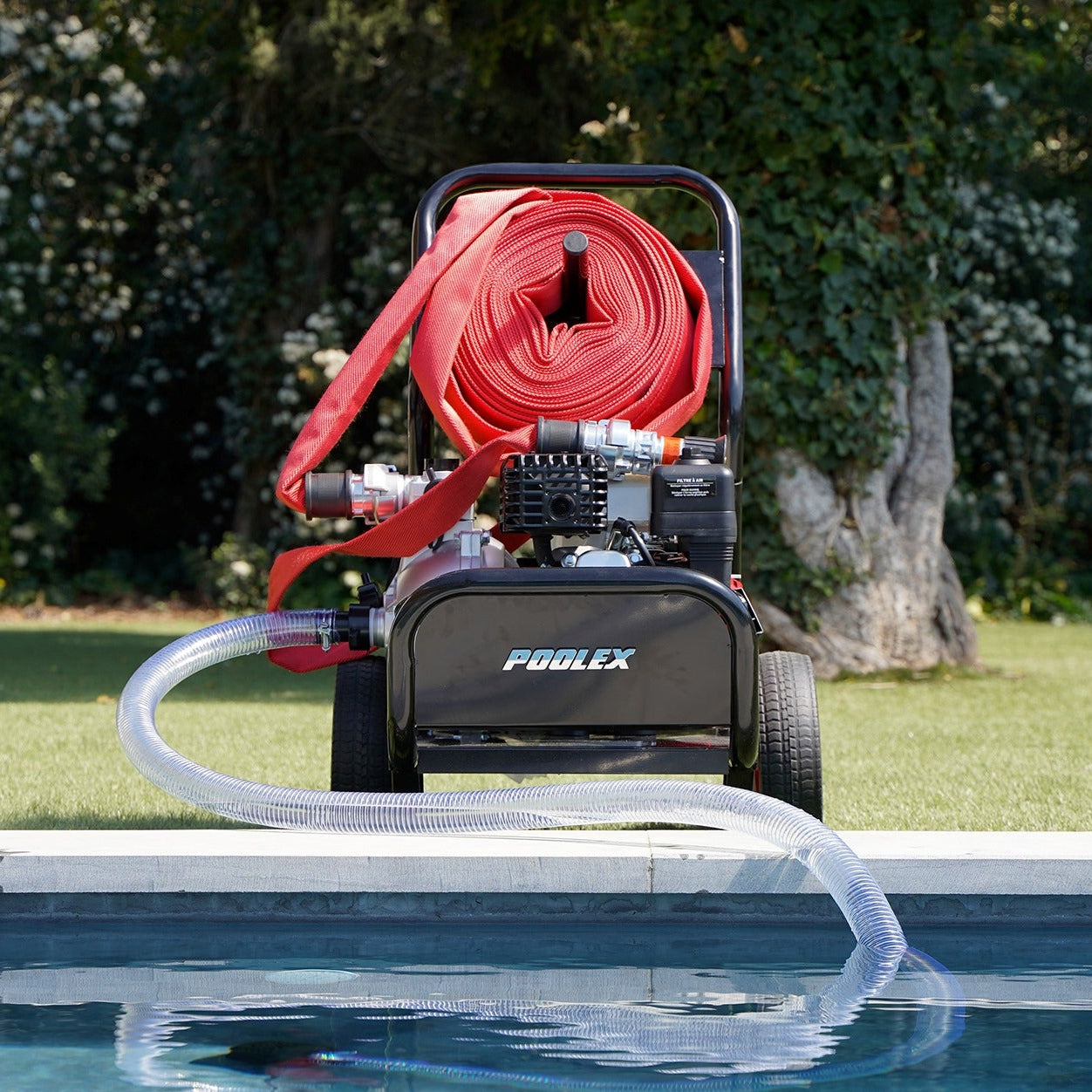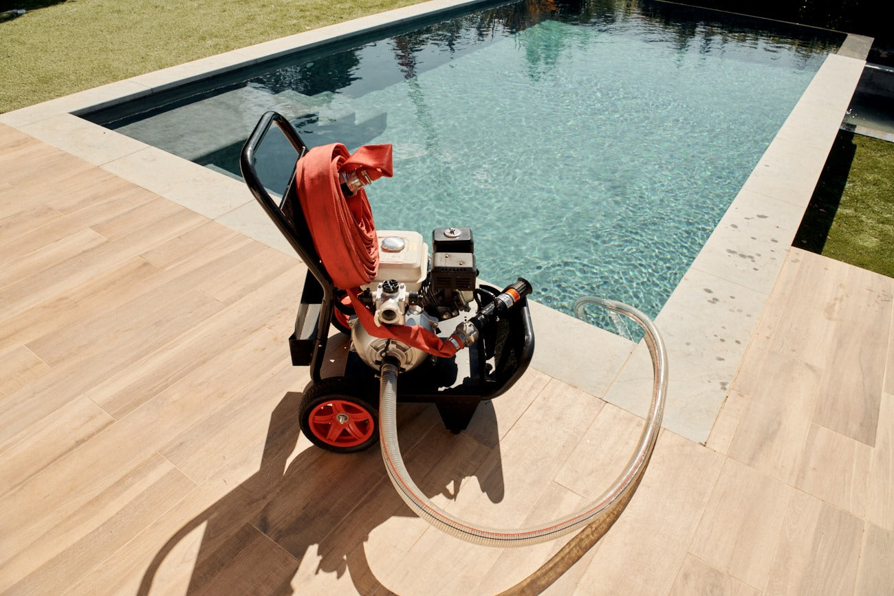 AQUAECO é um dispositivo de emergência que utiliza a água da sua piscina para extinguir pequenos incêndios ou conter o fogo até à chegada dos bombeiros, oferecendo uma resposta rápida e segura em situações de risco.